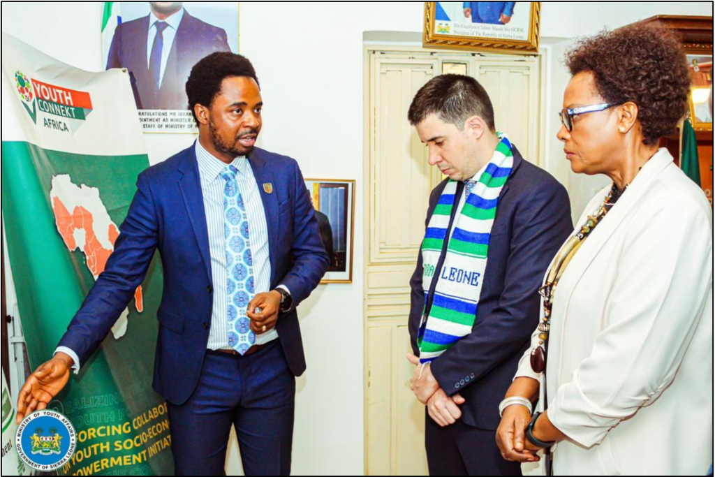 Ibrahim Sannoh, Minister of Youth Affairs, welcomed Dr Felipe Paullier, UN Assistant Secretary-General for Youth Affairs and Head of the UN Youth Office, to the Ministry’s Scan Drive office in Freetown on Tuesday. Dr Paullier, accompanied by UN Resident Coordinator Seraphine Wakana, paid his first official visit to Sierra Leone, which both sides described as an important step toward deepening cooperation on youth development and policy reform.