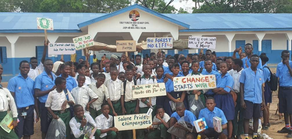 Tacugama Chimpanzee Sanctuary’s Community Outreach Programme (TCOP) recently conducted a focused education and engagement mission in communities surrounding Outamba-Kilimi National Park (OKNP), enhancing young people’s understanding of chimps, biodiversity, and the role of healthy ecosystems in sustaining local livelihoods. The team left Freetown on March 22nd and implemented a structured program that included classroom-based learning, interactive competitions, community outreach, and hands-on field experiences to reach a diverse group of students, teachers, and leaders.